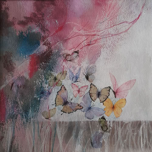 Tanz der Schmetterlinge 25 x 25 cm, Acryl-Collage-Mischt. auf Papier