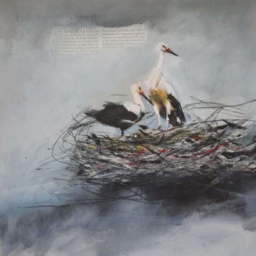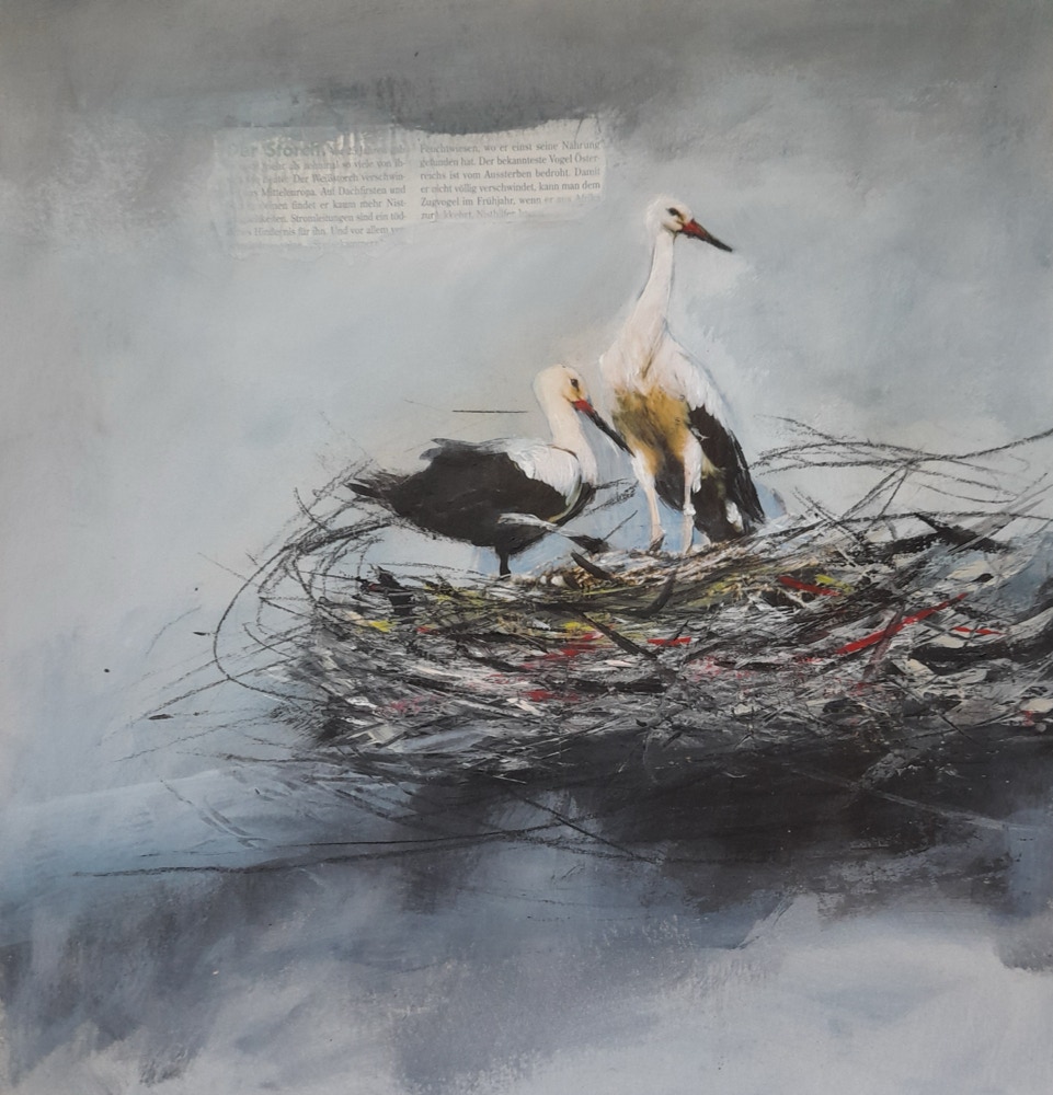 Störche, 40 x 35 cm, Collage Acryl - Mischt. auf Karton